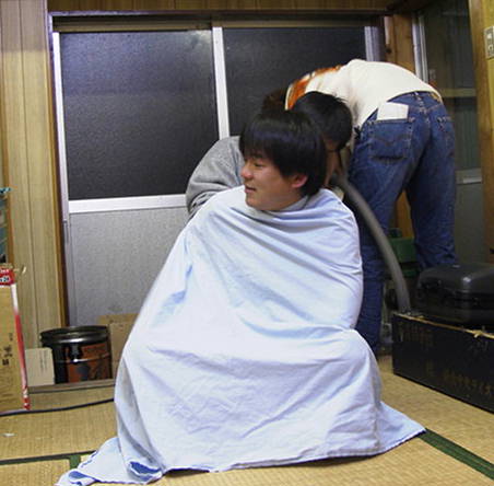 毎月11日は消防の定例会です。 で みんなが集まったところで 厳かに断髪式は行われました。