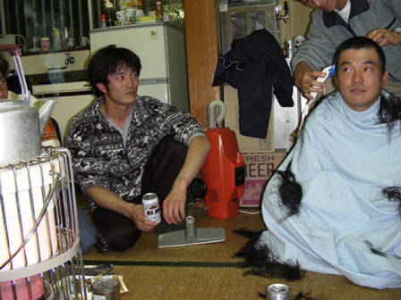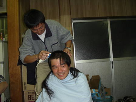毎月11日は消防の定例会です。 で みんなが集まったところで 厳かに断髪式は行われました。